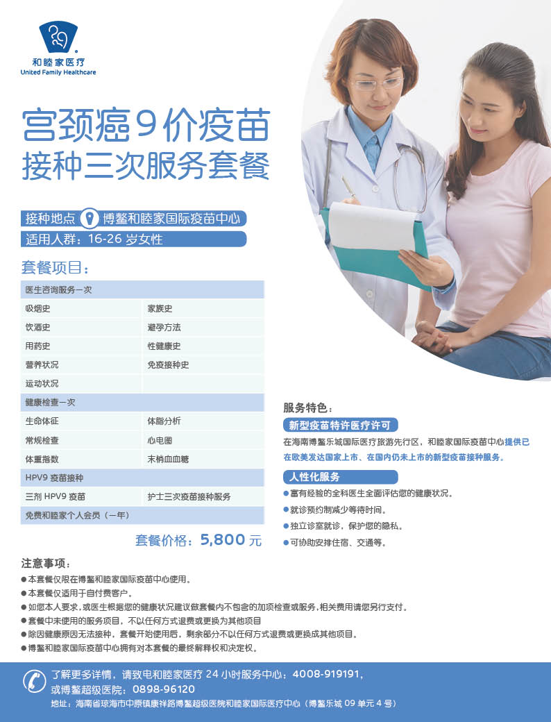 依托海南博鳌乐城超级医院的特许医疗平台,和睦家医疗将为儿童提供与国际接轨的疫苗接种计划,除一类、二类疫苗外,还会提供新型的进口的多联疫苗和多价疫苗,可以显著降低宝宝的预防接种针次,为宝宝提供更全面的保障。另外,我们将与国际接轨,有机会为成人提供还未在中国获得上市批准的新型疫苗,如九价人乳头瘤病毒(HPV)疫苗等。