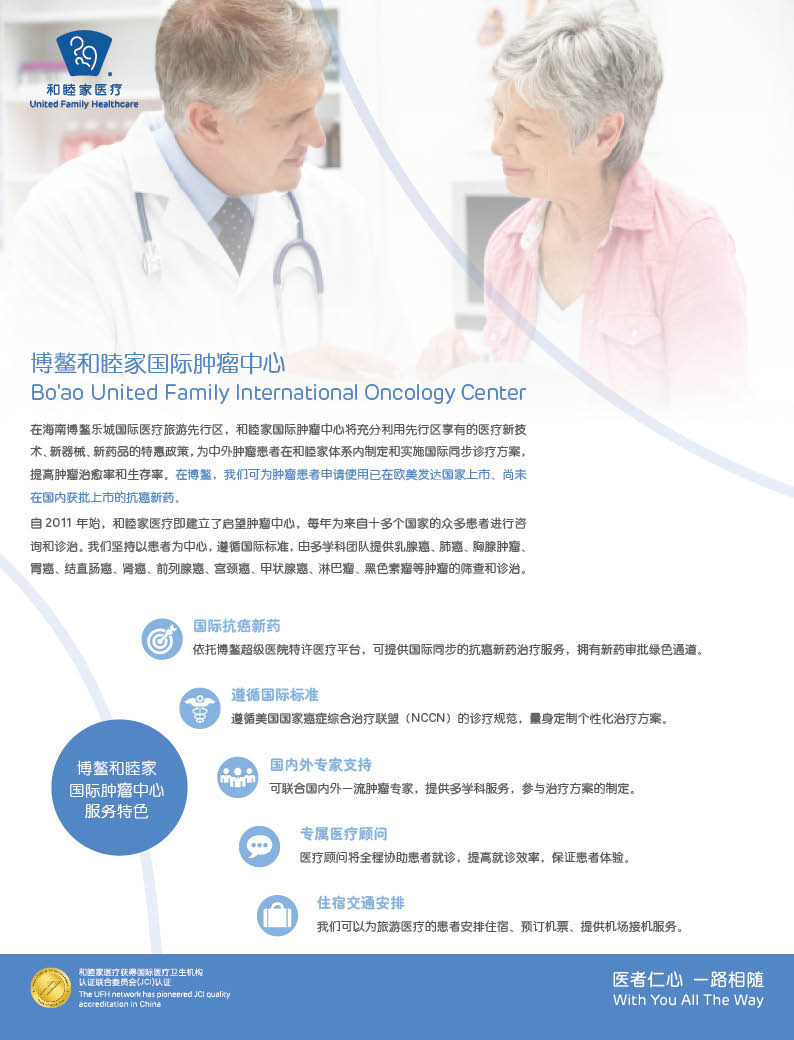 在海南博鳌乐城国际医疗旅游先行区,我们将继续遵循国际诊疗指南,充分利用先行区享有的医疗新技术、新器械、新药品的特惠政策,为肿瘤患者提供国际同步的肿瘤治疗手段,提高肿瘤治愈率和生存率。同时我们将延续与国内外多家一流肿瘤医院及专家的合作,为患者提供国内外专家的会诊服务。